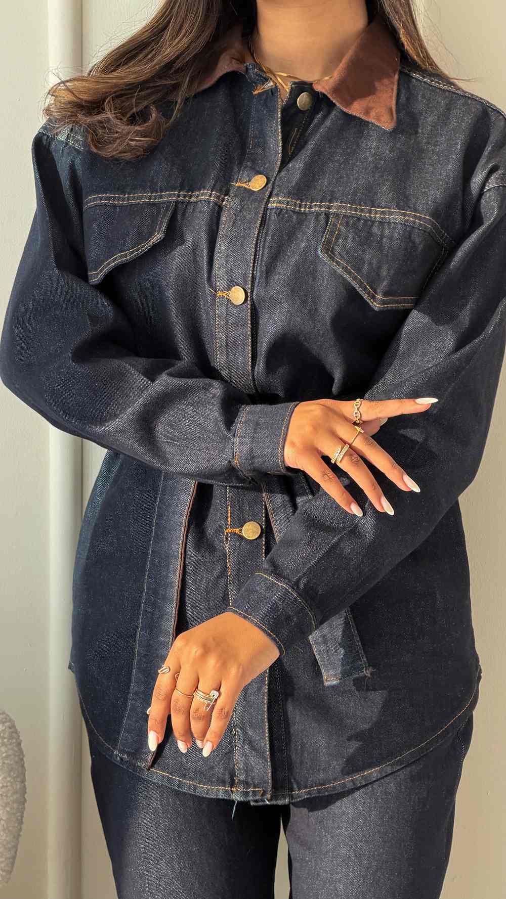 طقم من قطعتين من الدنيم (جاكيت قميص + بنطلون)