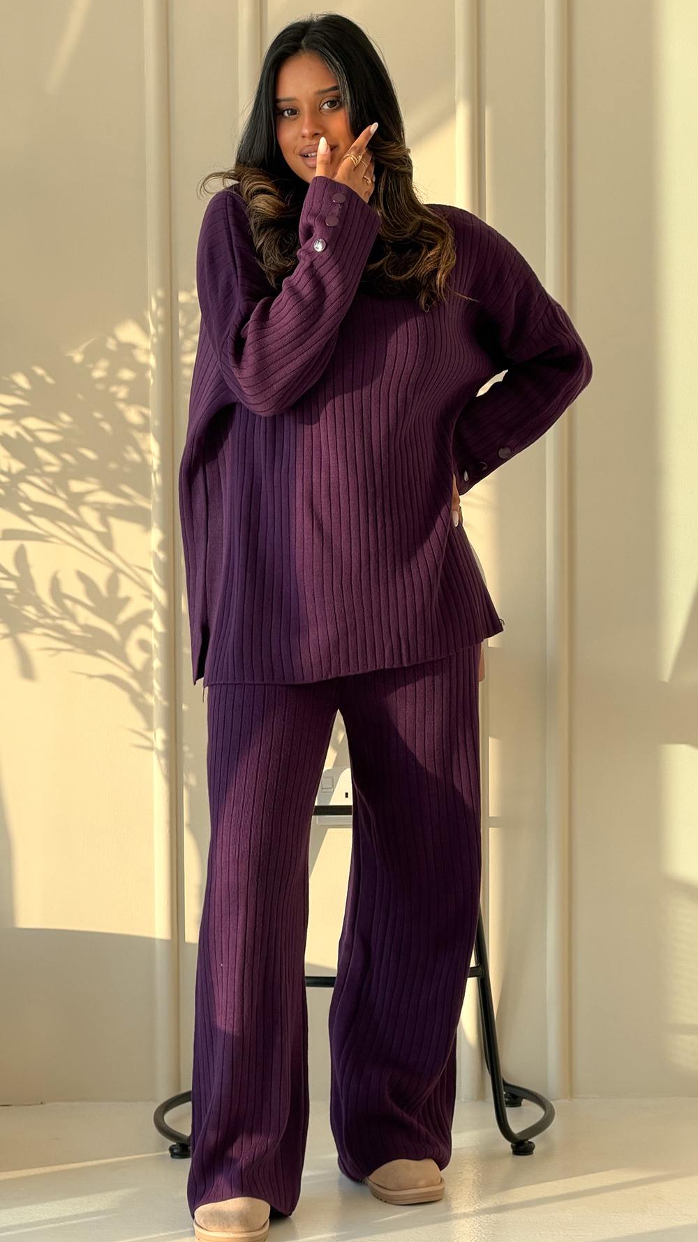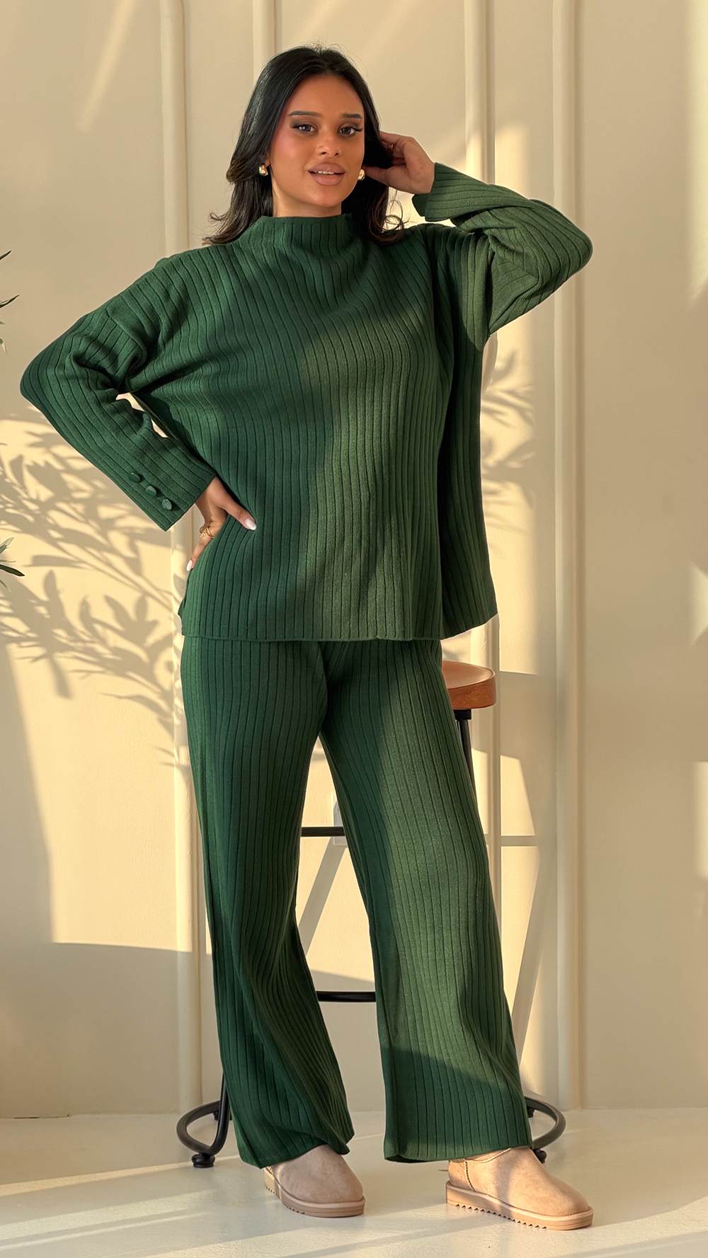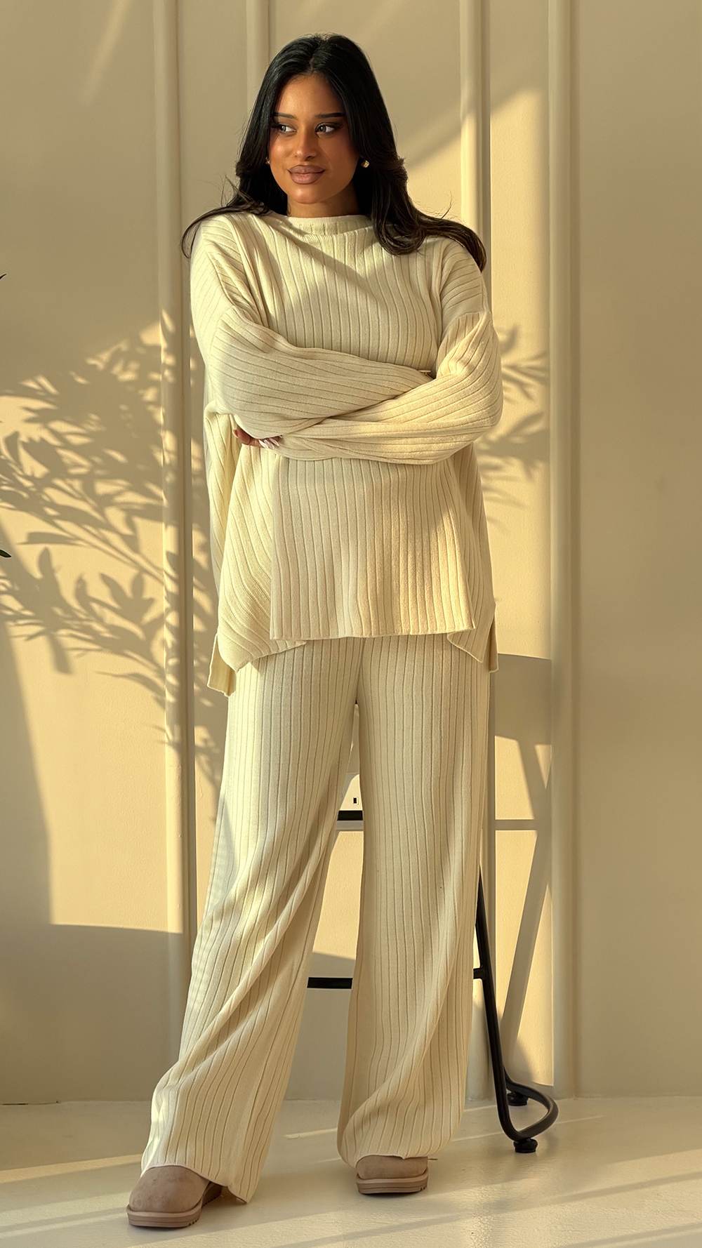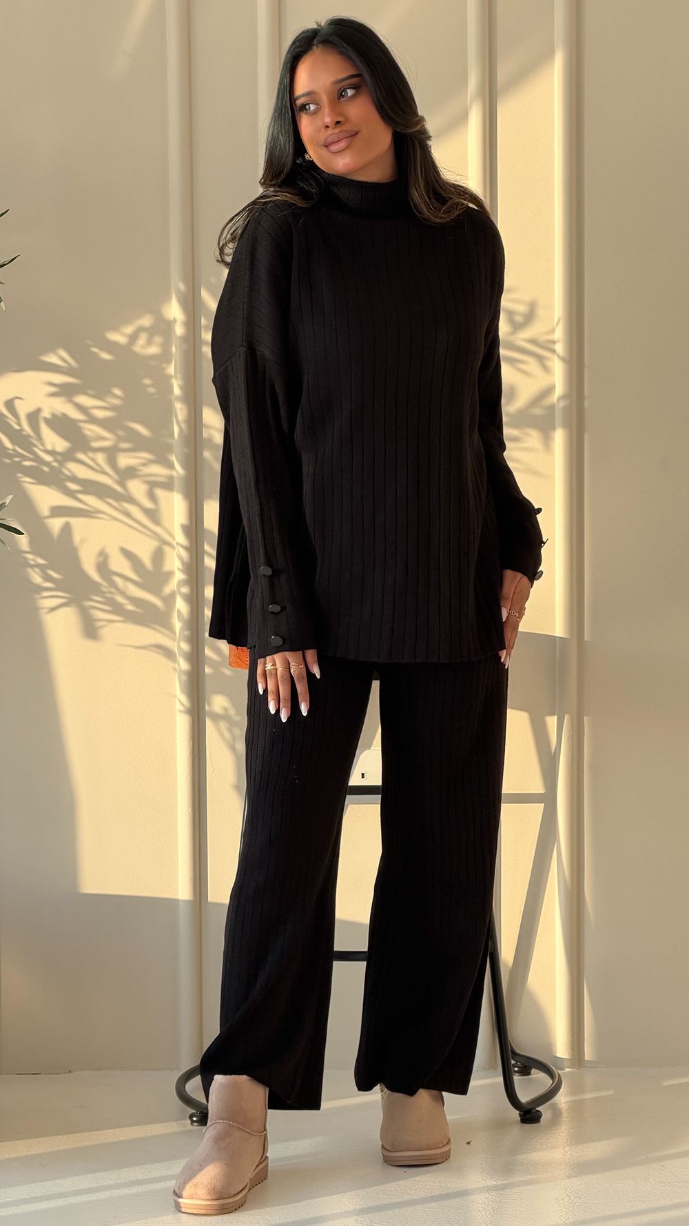 The top features a clean high neckline with subtle side slits for a flattering drape, while the wide-leg pants complete the look with a fluid, comfortable fit. Thoughtful details like ribbed texture and buttoned sleeve accents add a touch of sophistication to this easygoing ensemble.