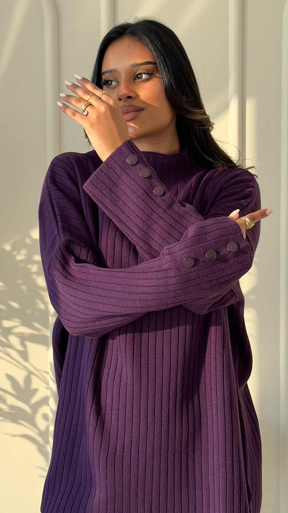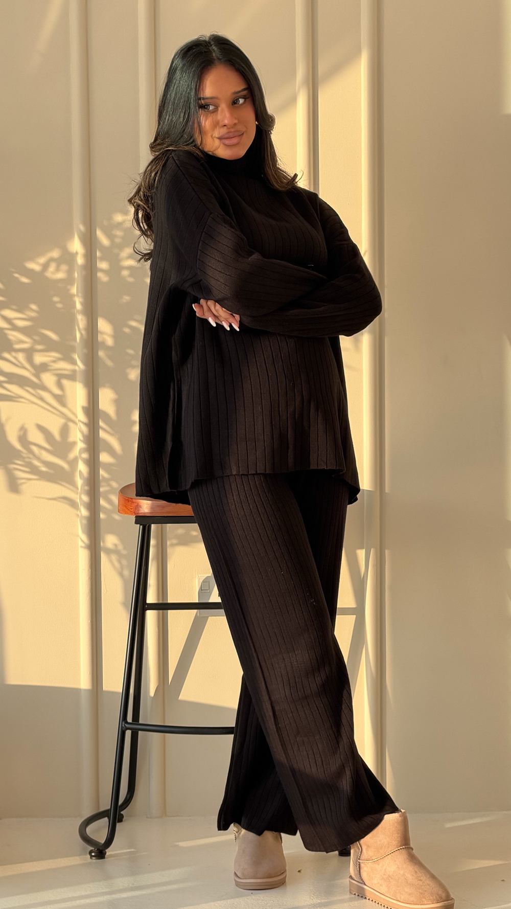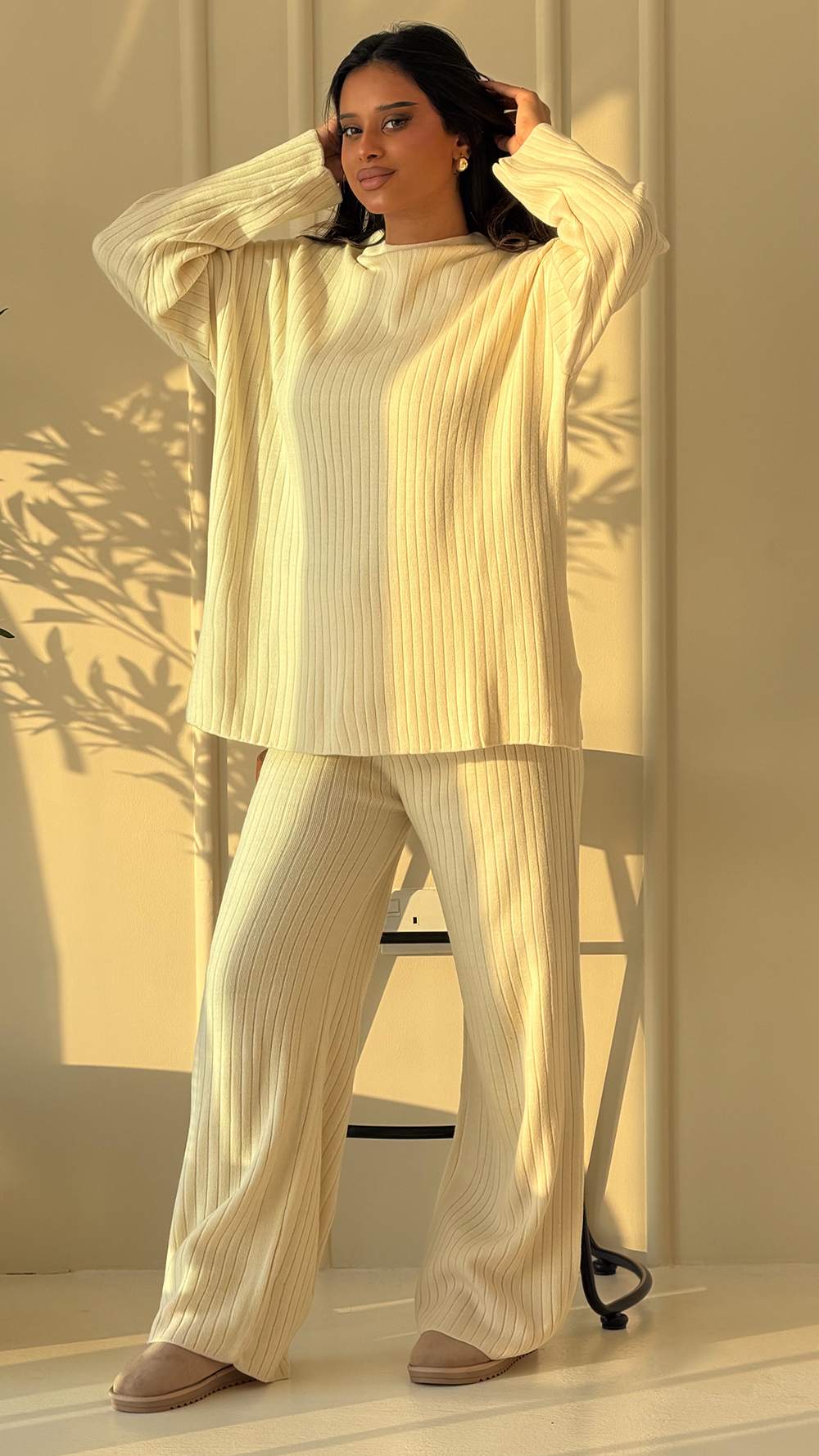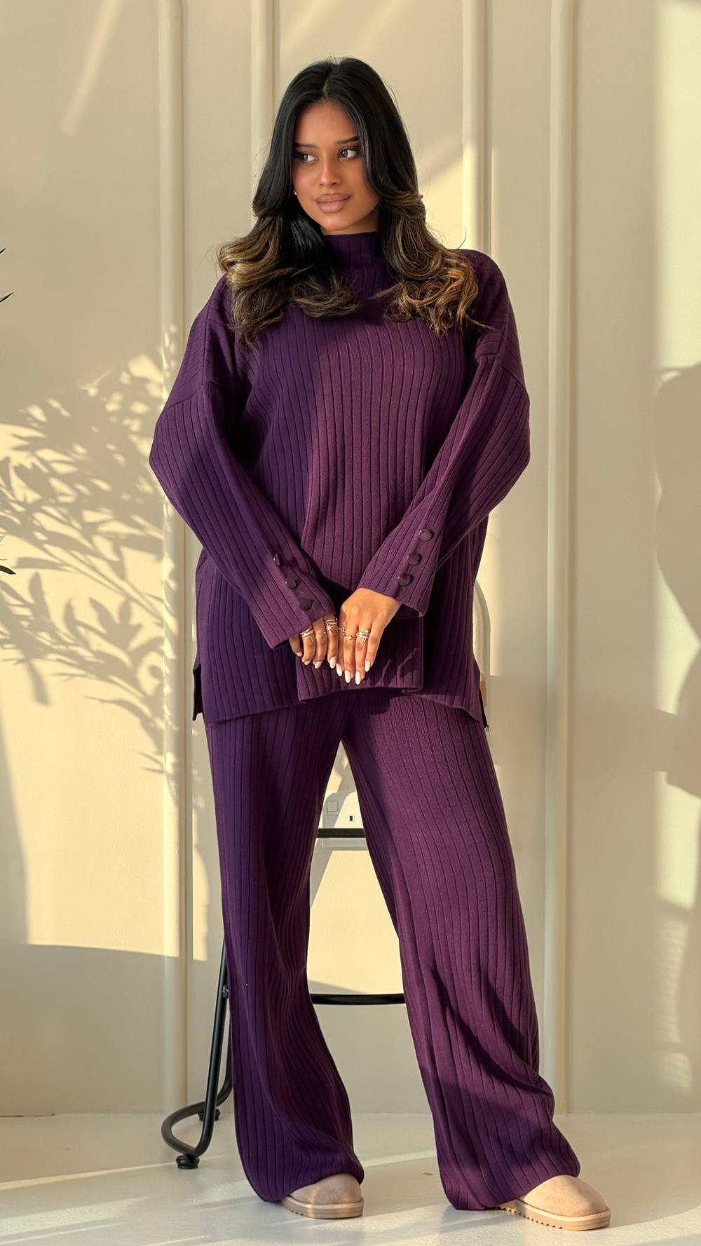 The top features a clean high neckline with subtle side slits for a flattering drape, while the wide-leg pants complete the look with a fluid, comfortable fit. Thoughtful details like ribbed texture and buttoned sleeve accents add a touch of sophistication to this easygoing ensemble.